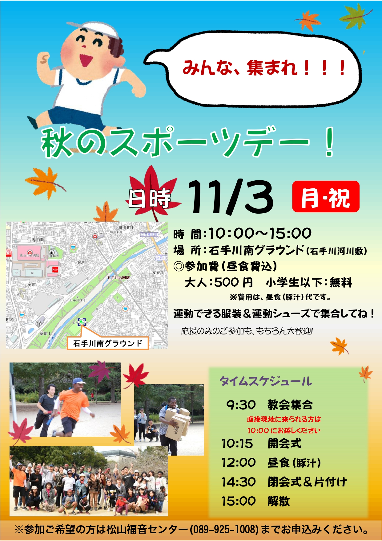 気持ちのよい季節。屋外で身体を動かしましょう。 子どもから年配の方まで楽しく遊び感覚でご参加いただけます。 応援だけのご参加もOK! お昼は、みんなでおいしい豚汁で楽しく食事をします。 日時:11月3日(月・祝日)午前9 […]