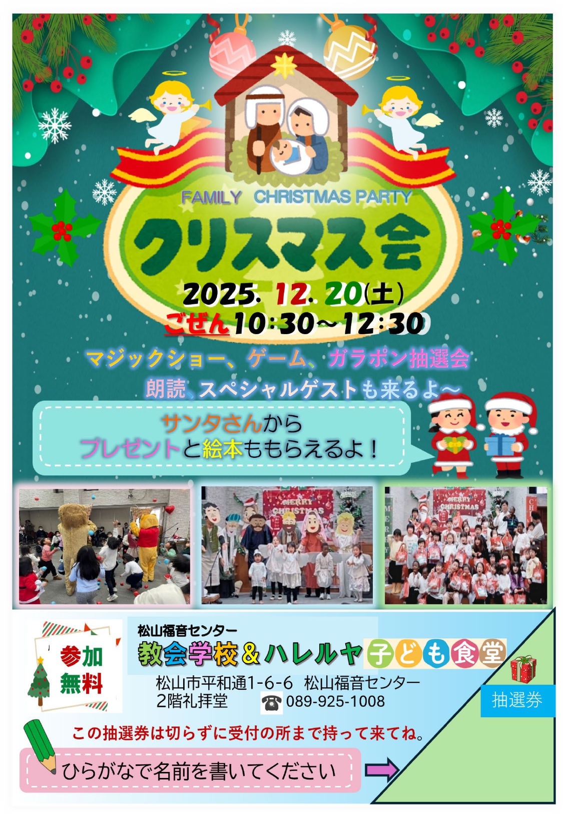 教会学校とハレルヤ子ども食堂の共催 マジックショーやゲーム抽選会など楽しい内容が盛りだくさん! サンタさんからプレゼントと絵本ももらえます♡ チラシがないときは、プリントして抽選券を持ってきてね! 日時:20日(土)午前 […]