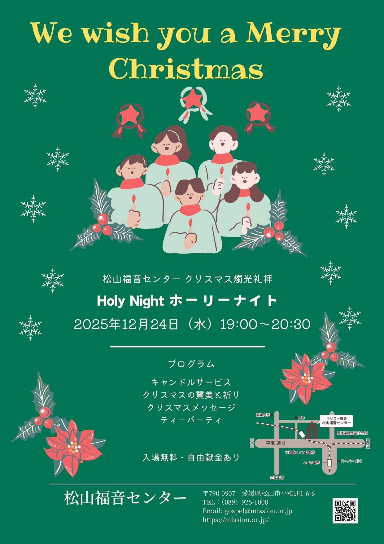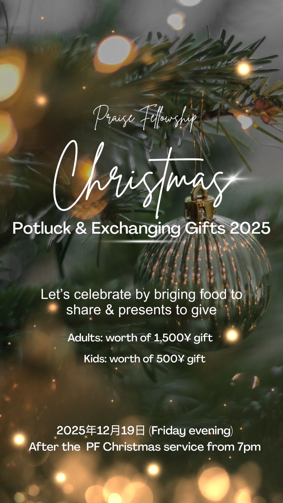 内容はすべて英語です。礼拝後に持ち寄りパーティーがあります。 また、プレゼント交換もありますので、チラシの内容をご確認の上、ご準備ください。どなたでも自由にご参加いただけます。 開催日:12月19日(金) 午後7:00~ […]