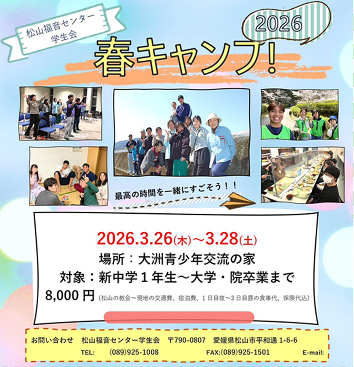 日にち:2026年3月20日(金・祝)時間:午後4時会場:松山福音センター2階礼拝堂入場無料生バンドで本場のゴスペルを楽しめますライブの後は、陽気な出演者とミニパーティーをしますのでお楽しみに!お待ちしています!