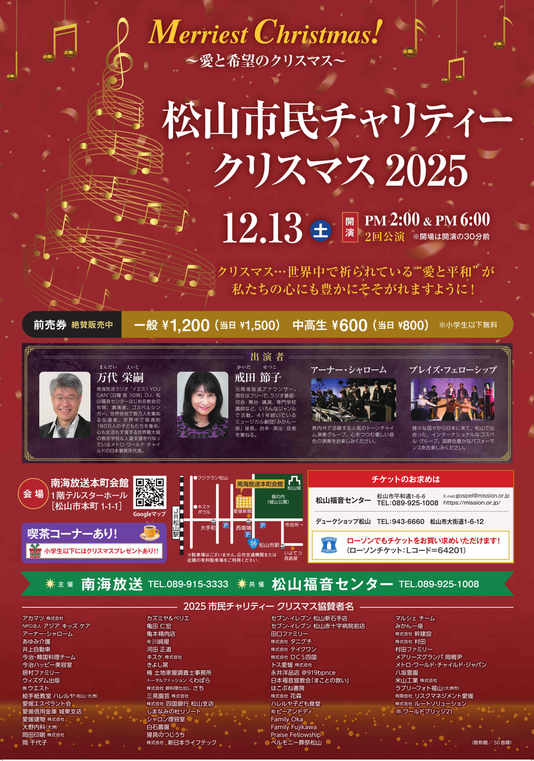 2025年11月22日 / 最終更新日時 : 2025年11月22日 福音センター イベント情報 市民チャリティークリスマス2025 12月13日(土) クリスマスにお送りする歌とダンス、スペシャルトーク 愛と平和が私たちの心に豊かに注がれますように! 喫茶コーナーあり、小学生以下の子どもにはクリスマスプレゼントあり 出演:万代栄嗣 戒田節子 アーナー・シャローム プレ […]