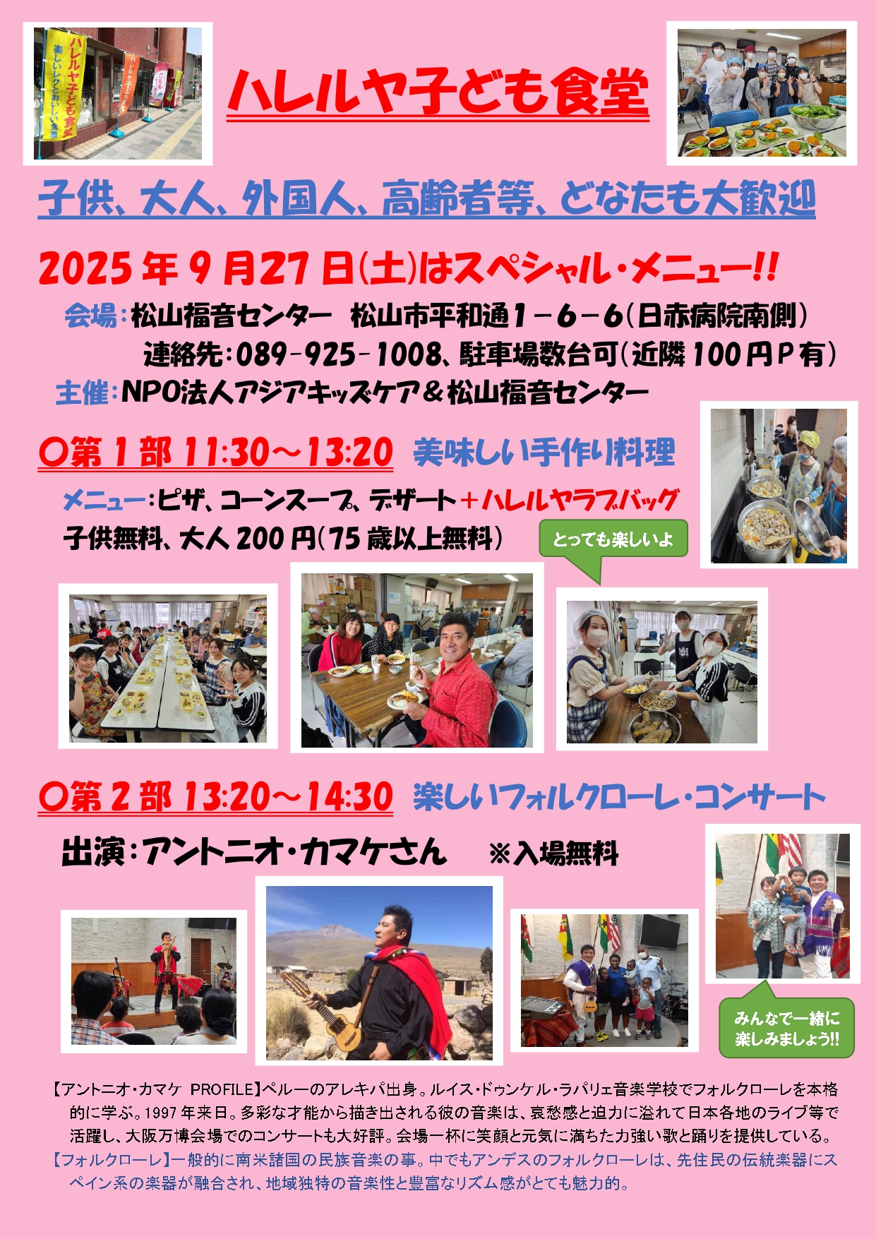 2025年10月5日 / 最終更新日時 : 2025年10月5日 福音センター イベント情報 ハレルヤ子ども食堂 10月11日(土) 開催日:10月11日(土) 時間:11時半~13時半場所:松山福音センター 〒790-0807 愛媛県松山市平和通1-6-6対象:どなたでもご参加ください費用:子ども無料(高校生まで)、大人200円(後期高齢者無料) 楽 […]