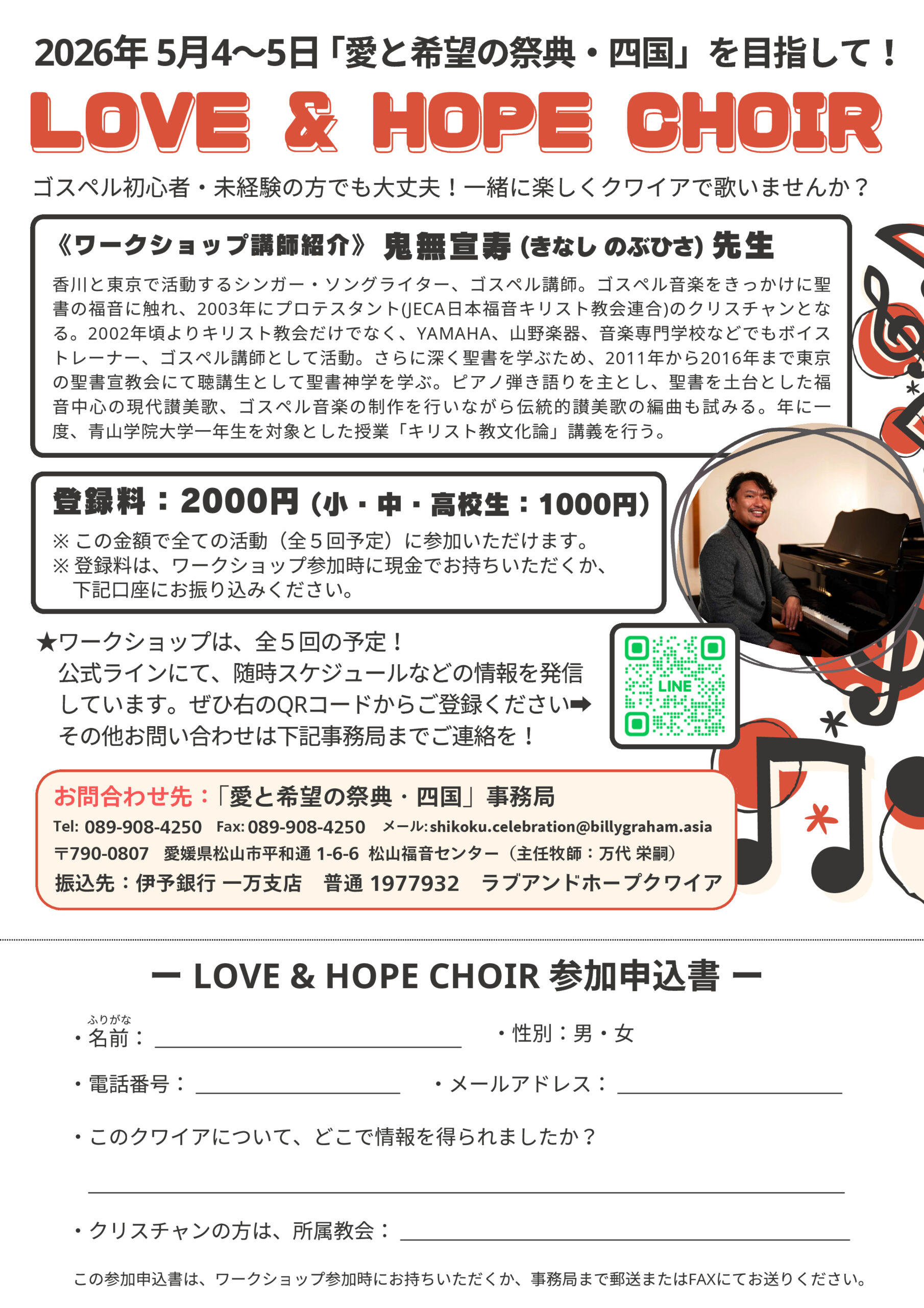 2025年10月12日 / 最終更新日時 : 2025年10月12日 福音センター イベント情報 ゴスペル・クワイア・ワークショップ10月18日(土) 2026年5月に開催される愛と希望の祭典・四国を目指して練習中! LOVE & HOPE CHOIRの参加者を募集中です。 開催日:10月18日(土) 午後2:00~会場:松山福音センター お問い合わせ:「愛と希 […]