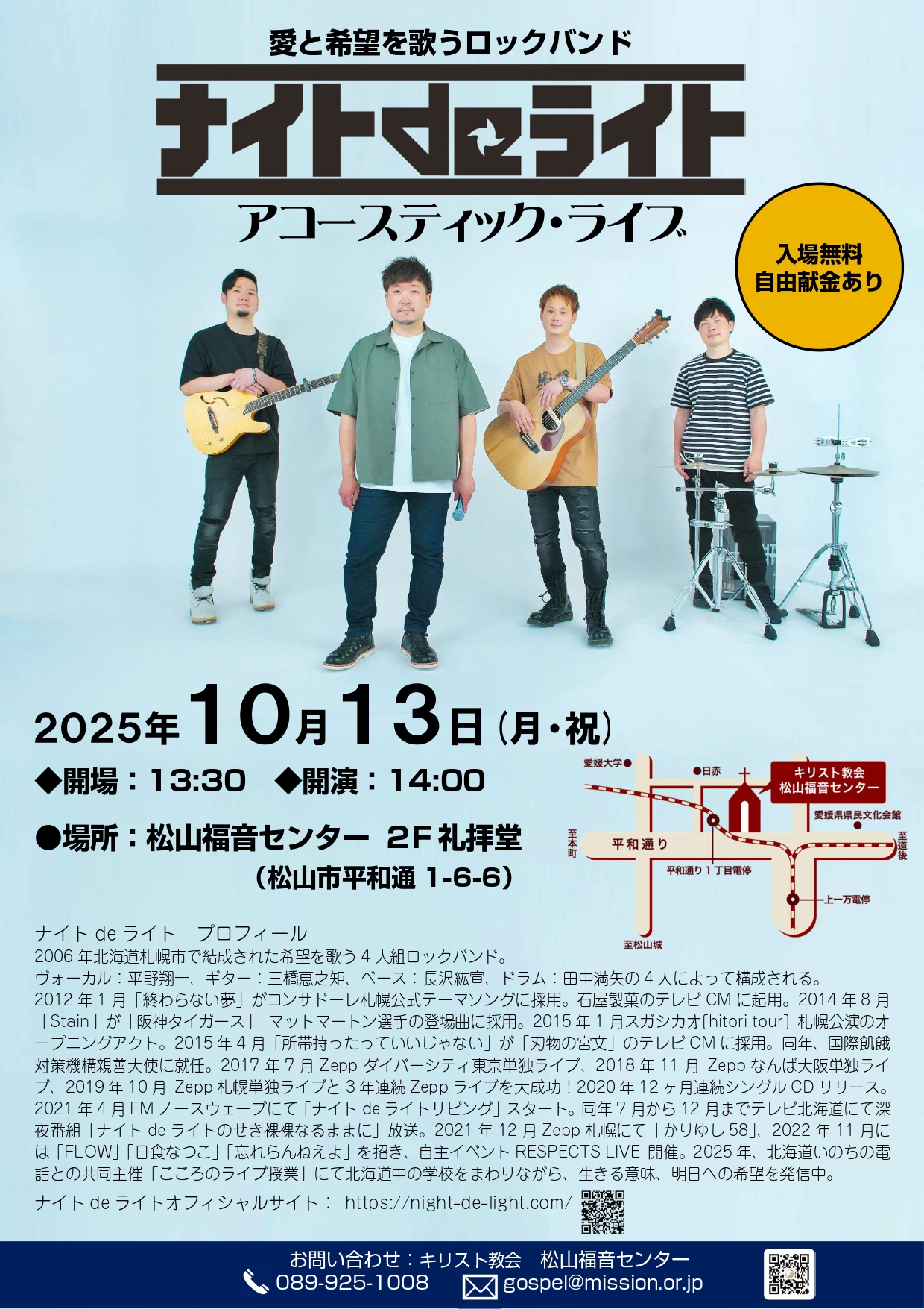 2025年10月5日 / 最終更新日時 : 2025年10月5日 福音センター イベント情報 チャペルコンサート 10月13日(月・祝) 出演:ナイトdeライト 開催日:10月13日(月・祝) 午後2:00~会場:松山福音センター お問い合わせ:日本福音宣教会 松山福音センター電話:089-925-1008メール:gospel@mission.or.jp