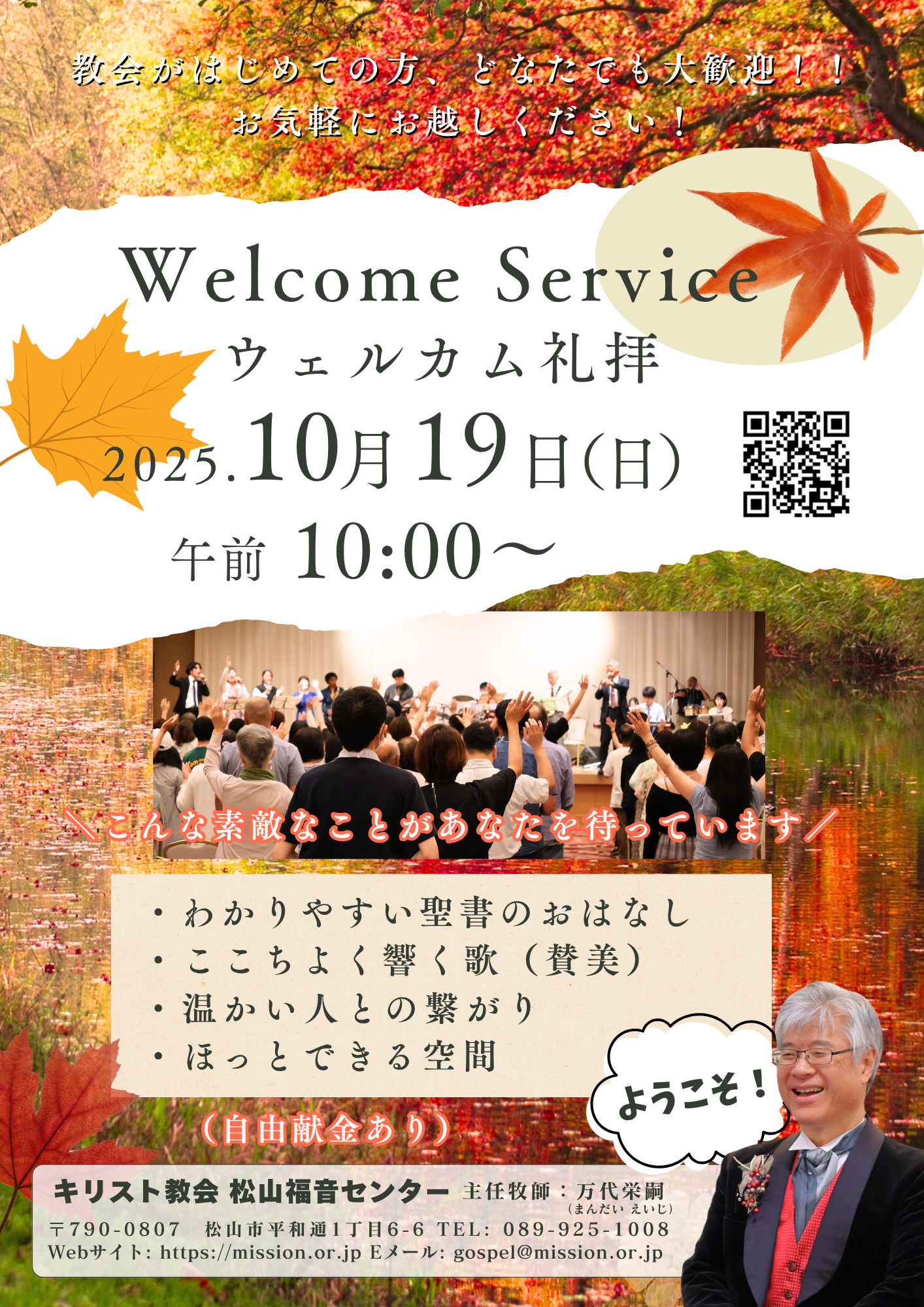 2025年10月12日 / 最終更新日時 : 2025年10月12日 福音センター イベント情報 ウェルカム礼拝10月19日(日) 初心者にもわかりやすい内容のお話です。どなたでも自由にご参加いただけます。 開催日:10月19日(日) 午前10:00~会場:松山福音センター(市内電車 平和通1丁目電停横) お問い合わせ:電話:089-925-1008 […]