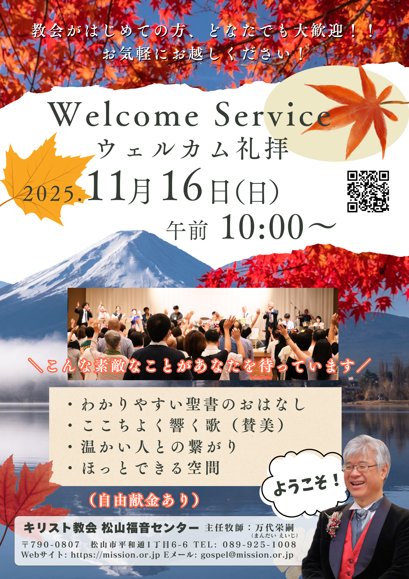 2025年11月9日 / 最終更新日時 : 2025年11月9日 福音センター イベント情報 ウェルカム礼拝11月16日(日) 初心者にもわかりやすい内容のお話です。どなたでも自由にご参加いただけます。 開催日:10月16日(日) 午前10:00~会場:松山福音センター(市内電車 平和通1丁目電停横) お問い合わせ:電話:089-925-1008 […]
